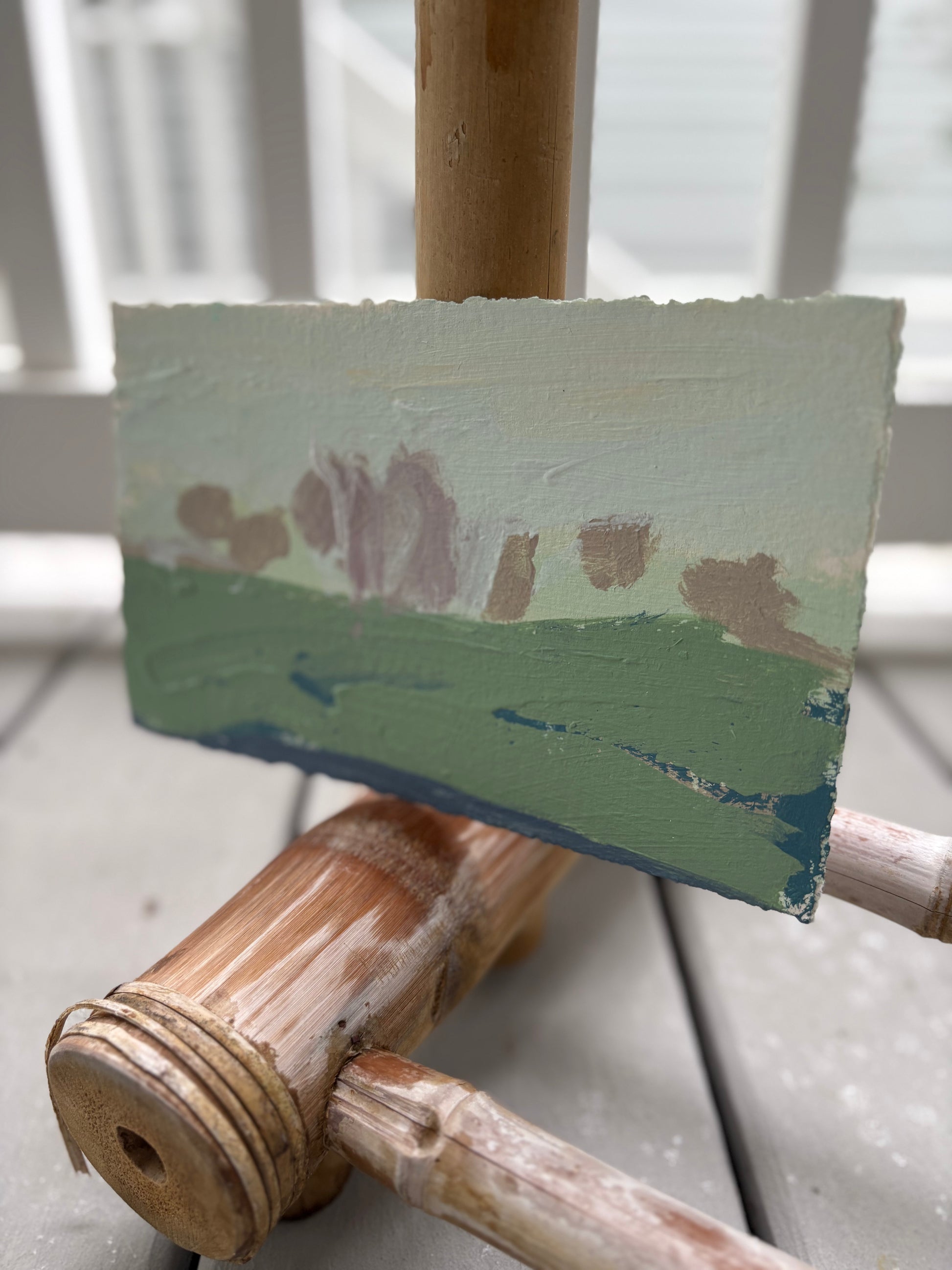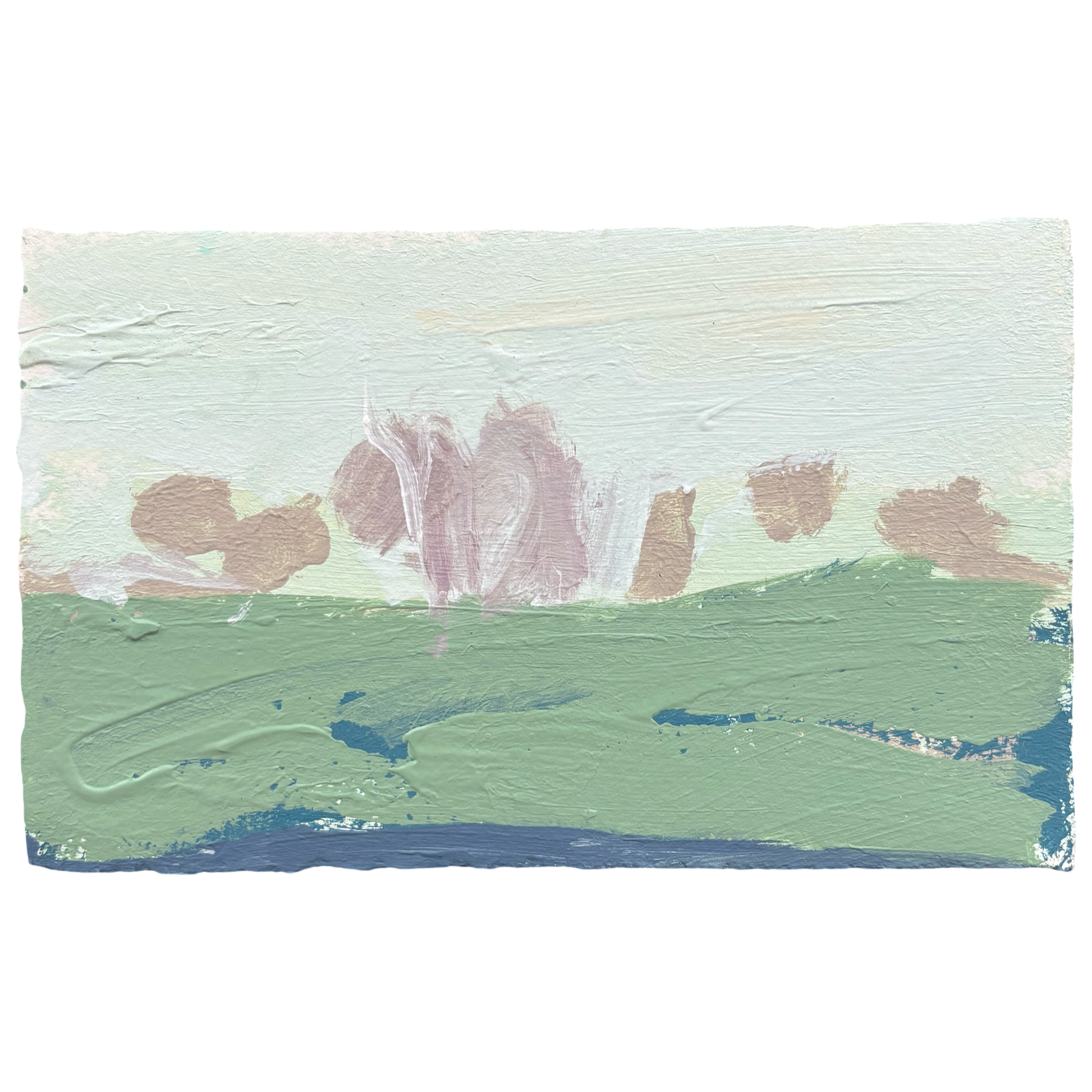 A simplified landscape composition with broad brushstrokes with muted pinks, greens, and periwinkle blues.