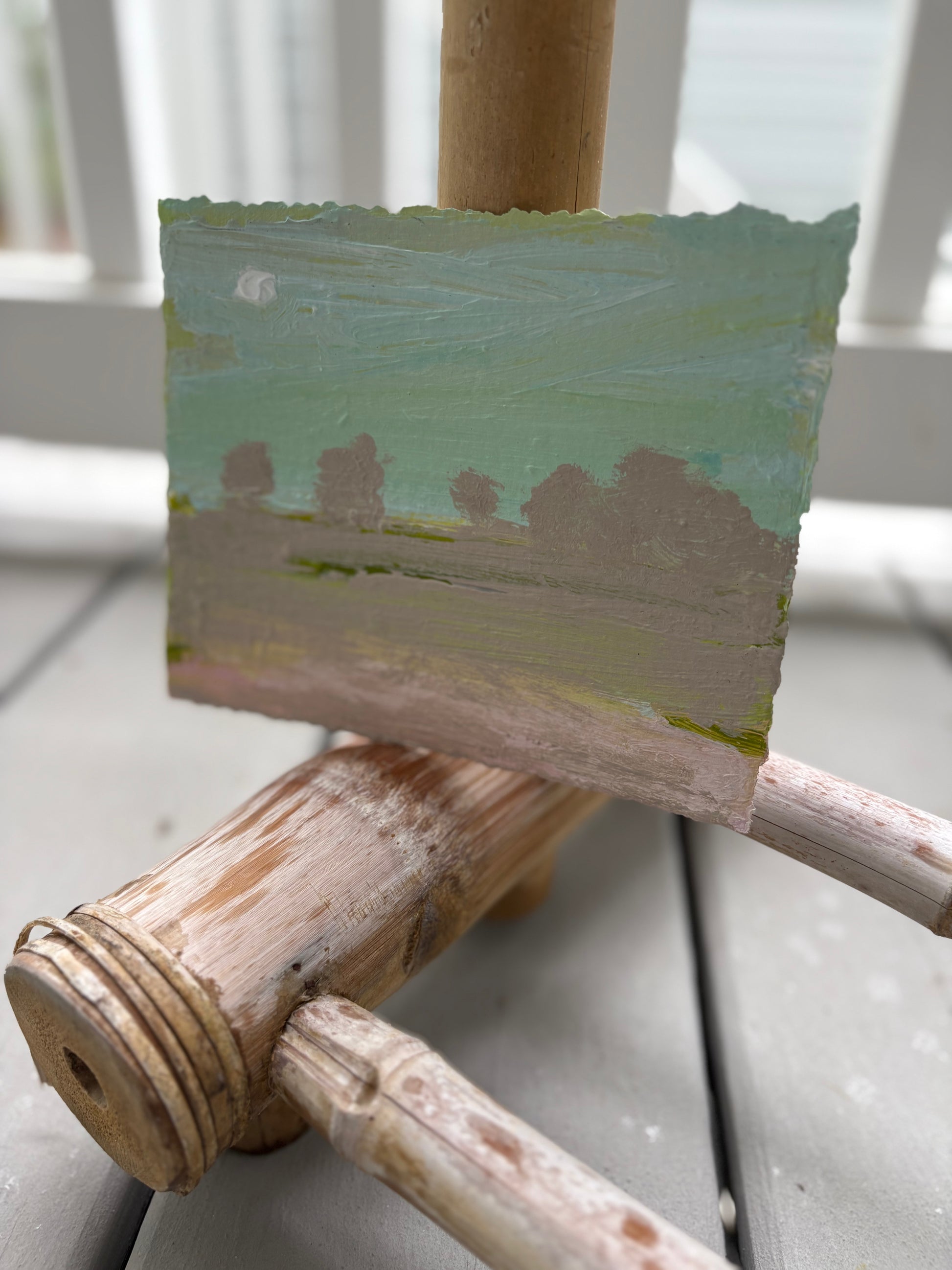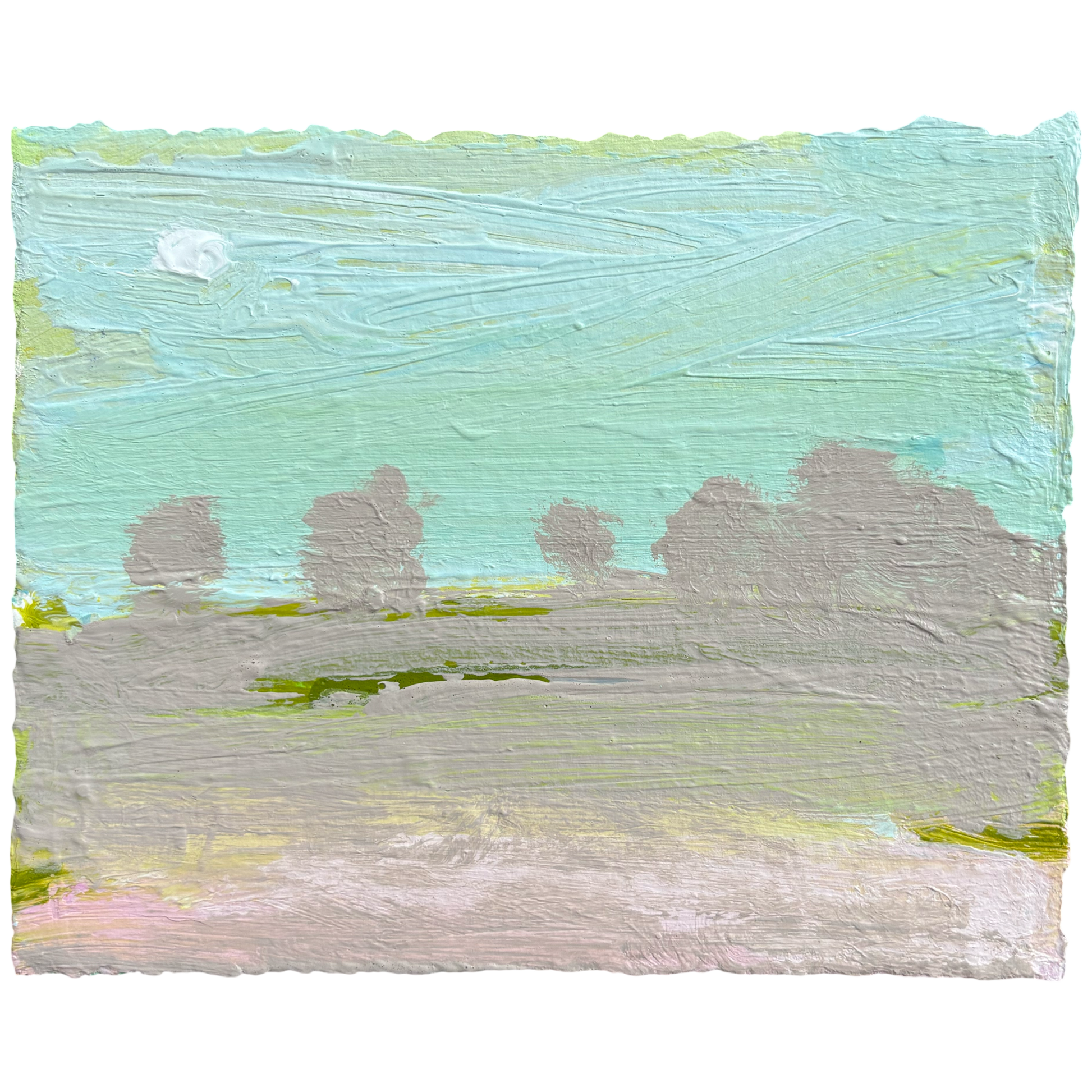 A simplified landscape composition with broad brushstrokes with muted pinks, greens, and mint blues.