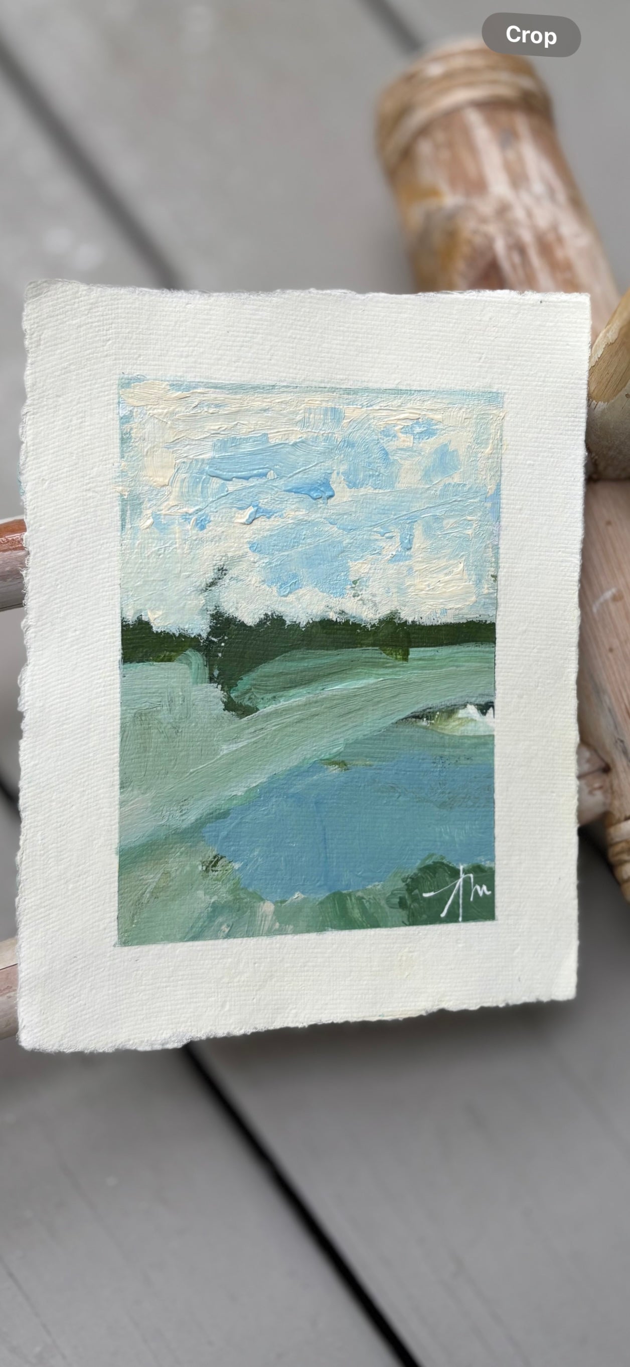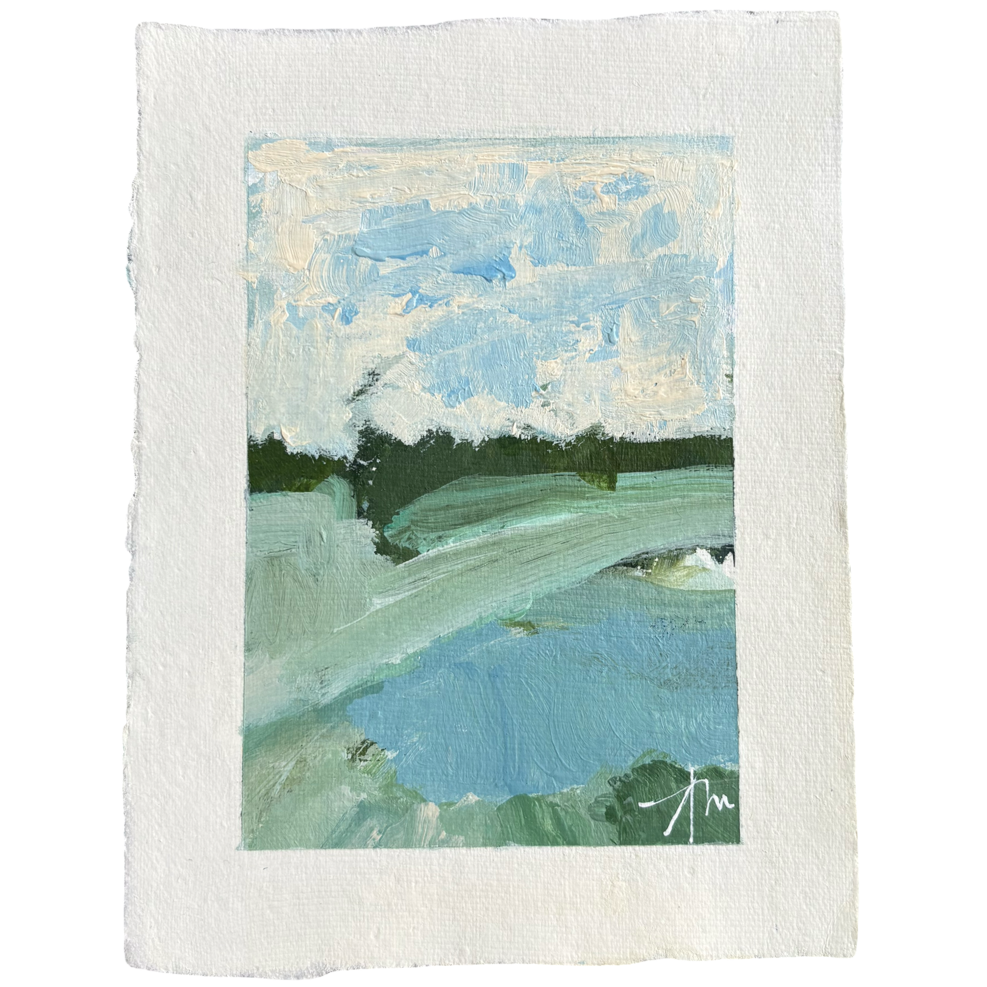 An abstract landscape with a color palette dominated by blues and greens and a depiction of southern memories.